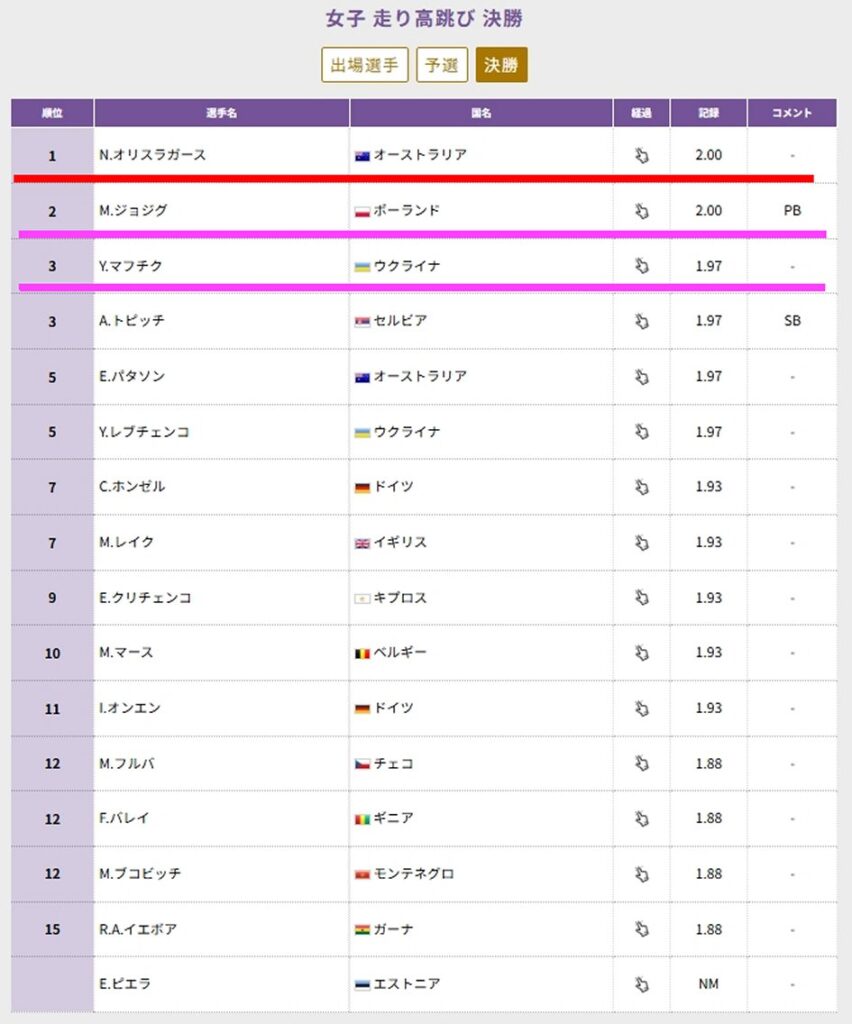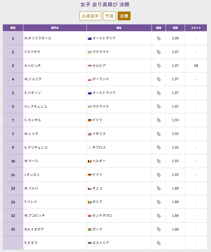 現時点では「Tokyo 2025 世界陸上 女子走高跳 決勝」の跳ぶ順番(スタートリスト)はまだ公式に発表されていないようです。