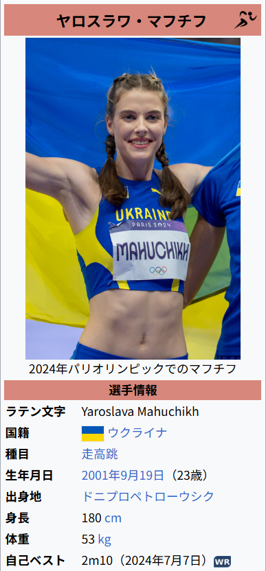 マフチク選手は2024年に世界記録(2m10)を樹立しており、今後も主要大会での活躍が期待されています。