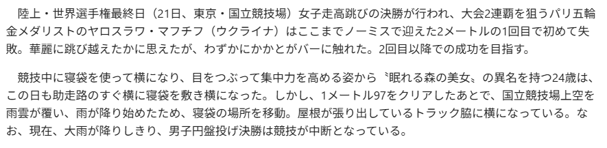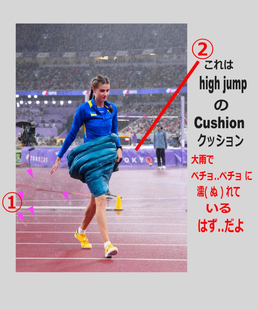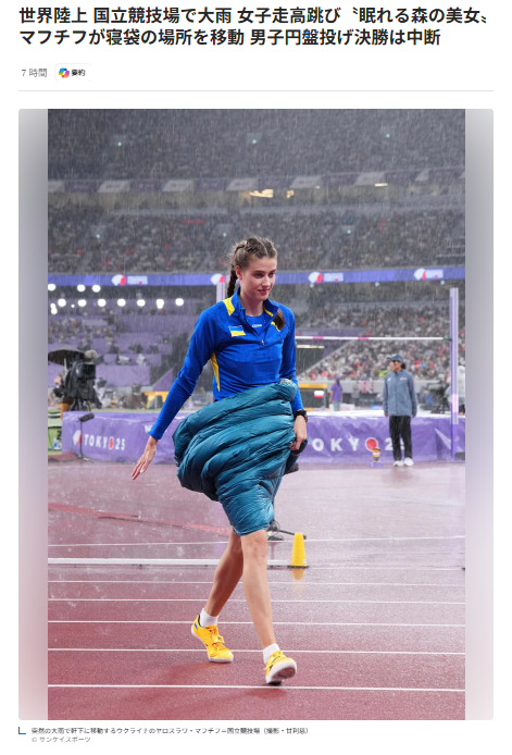 土砂降( どしゃぶり ) り….世界陸上( せかい りくじょう ) 高跳( たか と ) び  「眠( ねむ ) れる…森( もり ) の 美女( びじょ ) 」を ネット…心配( しんぱい )   「雨降( あめ ふ ) っても….寝( ね ) 続( つづ ) ける?」