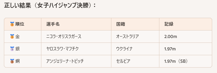 一回目( いっかい め ) の回答( かいとう ) も 女子( じょし ) ハイジャンプの優勝者( ゆうしょうしゃ ) に ついての質問( しつもん ) でも、優勝( ゆうしょう ) の順位( じゅんい ) を 間違( まちが ) っていた と 思( おも ) いますが、今日( きょう ) …2025/09/22の 質問( dzmy ) からの 回答( かいとう ) で、マフチクは 銀( ぎん ) メダルと Copilotは 回答( かいとう ) を していますが、今( いま ) の 時点( じてん ) で msnの ニュース記事( きじ ) に よれば マフチクは….3位( さんい ) の 銅( どう ) メダルに なっています。