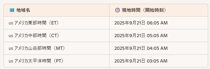 🇺🇸 アメリカ中部 時間(CT)2025年9月21日 05:05 AM