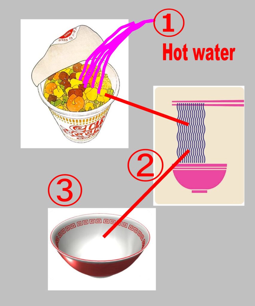 ③ の 容器( ようき )に 入( い )れた Noodles …を ときどき …..