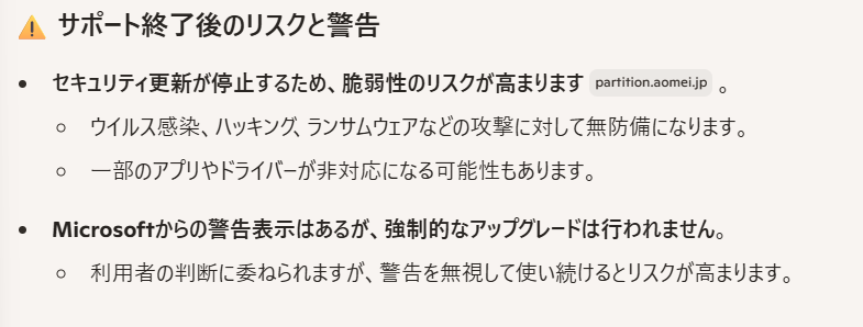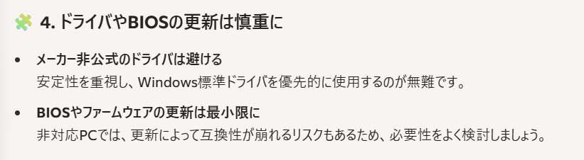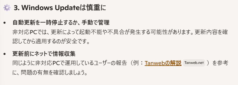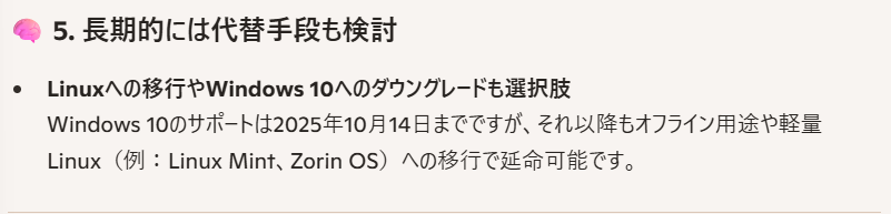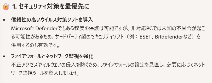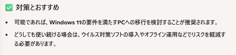 ご希望があれば、要件を満たさないPCでも安全に使い続けるための具体的な対策や、Windows 10への戻し方などもご案内できます。