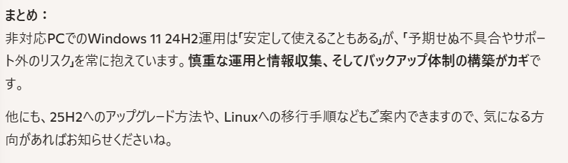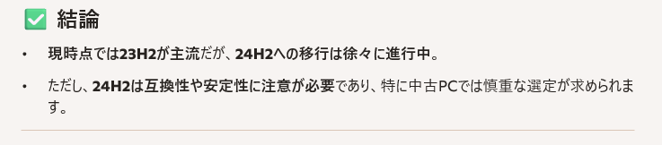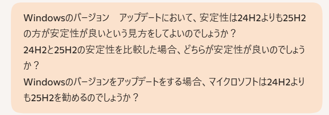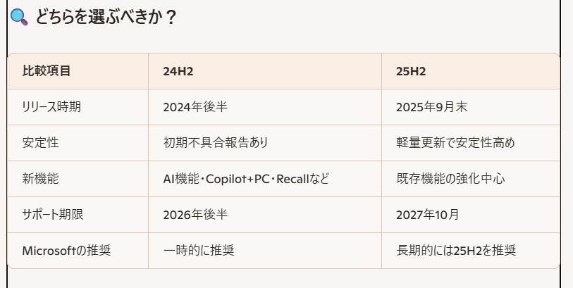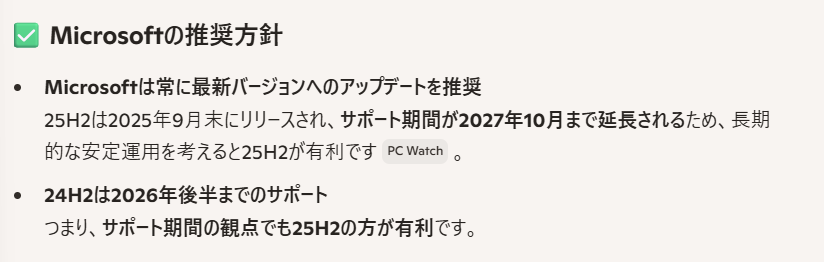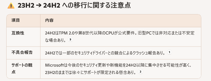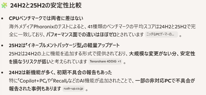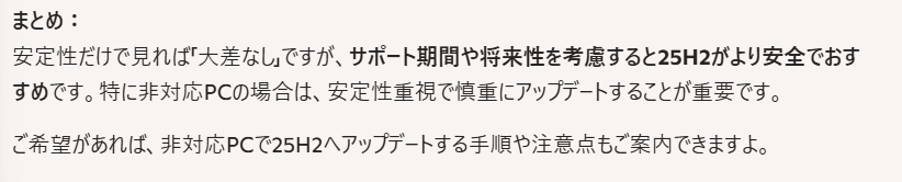 現時点では、Windows 11の「24H2」と「25H2」の安定性に大きな差はなく、どちらも同等の安定性とされています。ただし、Microsoftは最新のセキュリティとサポートの観点から、25H2へのアップデートを推奨しています。