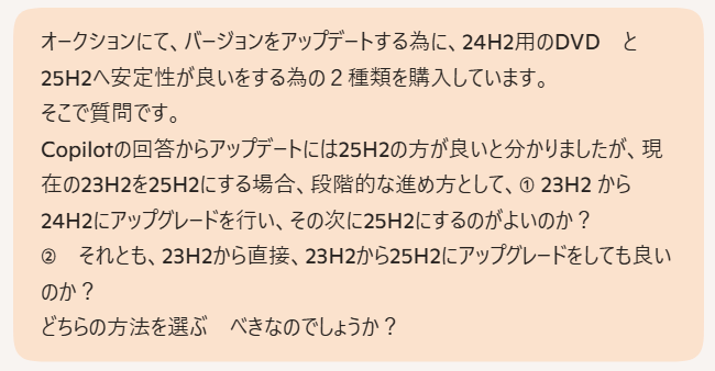 所有しているパソコンを Windows 11 の バージョン 23H2から 24H2にするのにオークションにて、非対応パソコンにも24H2にアップグレードに出来るDVDを購入して、23H2 から24H2に簡単にアップグレードが出来ました。 それで質問をします。 海外のオークション サイトにおいて、日本でのオークションの様に23H2から24H2 更に25H2にアップグレードが出来るDVDなどは出品されているのでしょうか? 日本のオークションでの….そのDVDの価格は約1000円くらいでした。