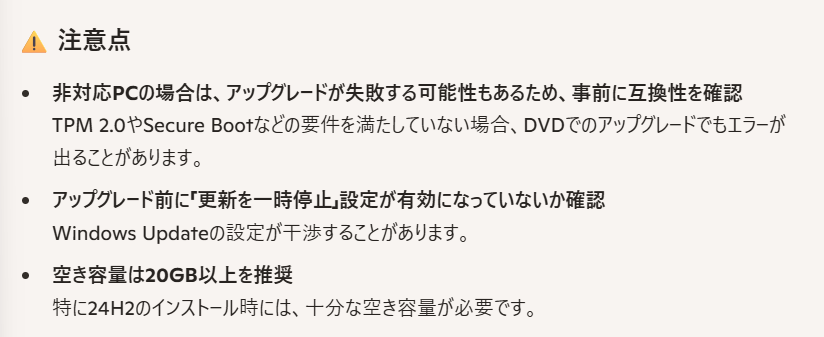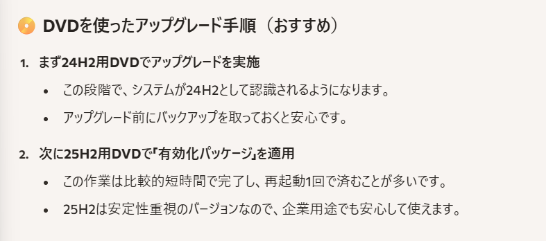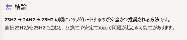 - さらに進んで25H2へのアップグレード方法も紹介しており、Webベースの手法が中心です。