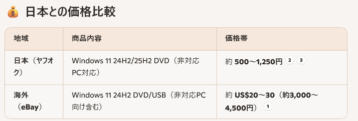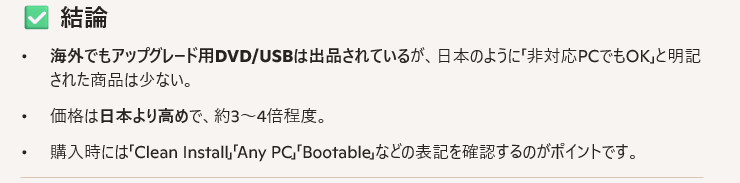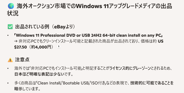 はい、海外のオークションサイト(特にeBay)でも、Windows 11のアップグレード用DVDやUSBメディアは出品されています。ただし、日本のように「非対応PCでもアップグレード可能」と明記されたものはやや少数派で、以下のような傾向があります: