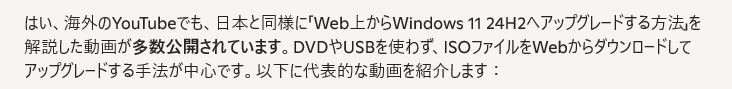 はい、海外のYouTubeでも、日本と同様に「Web上からWindows 11 24H2へアップグレードする方法」を解説した動画が多数公開されています。DVDやUSBを使わず、ISOファイルをWebからダウンロードしてアップグレードする手法が中心です。以下に代表的な動画を紹介します: