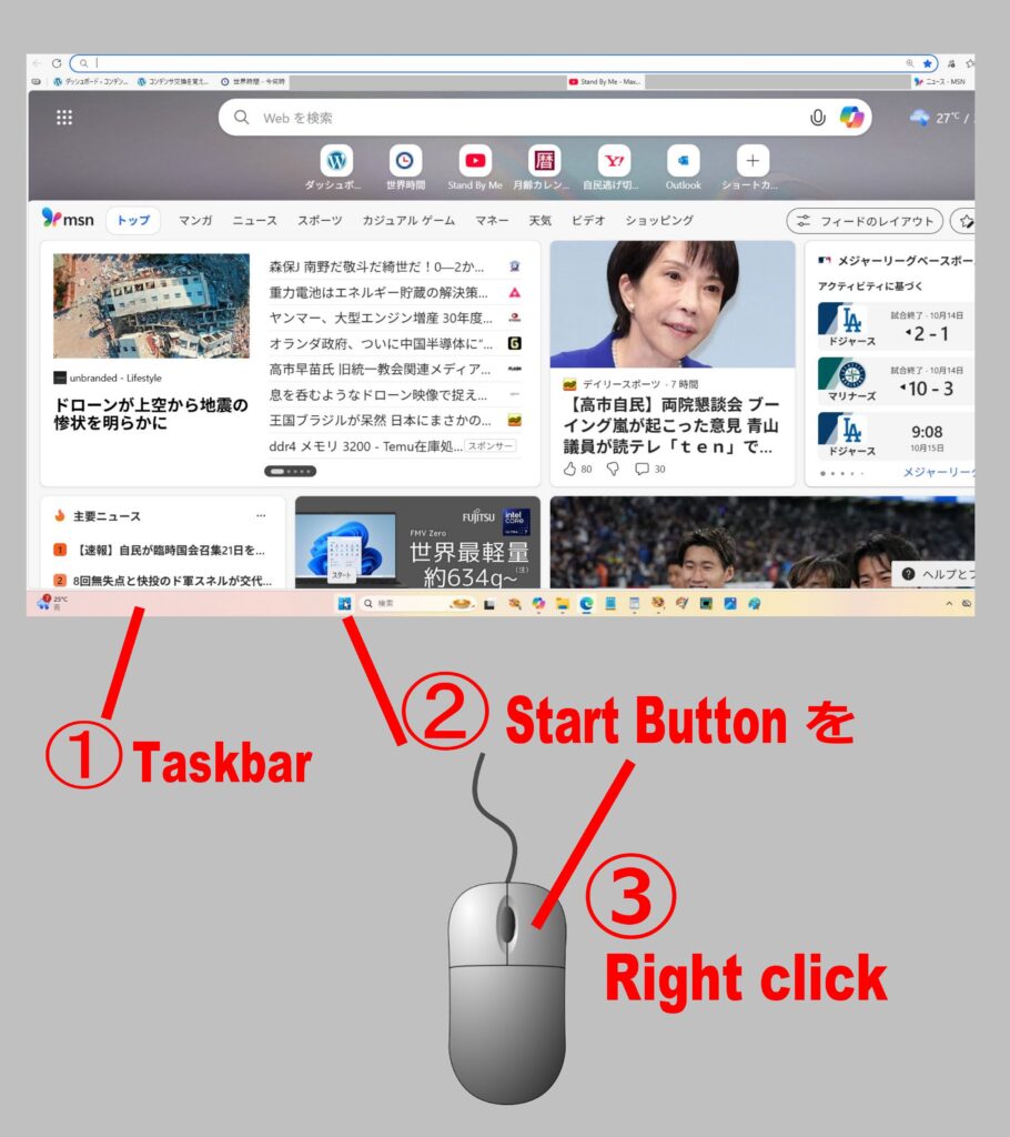 モニター の 下側( したがわ ) に ある= タスクバー の 中( なか )にある