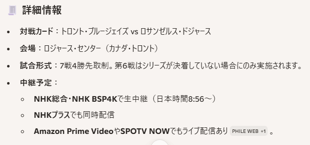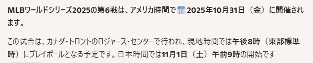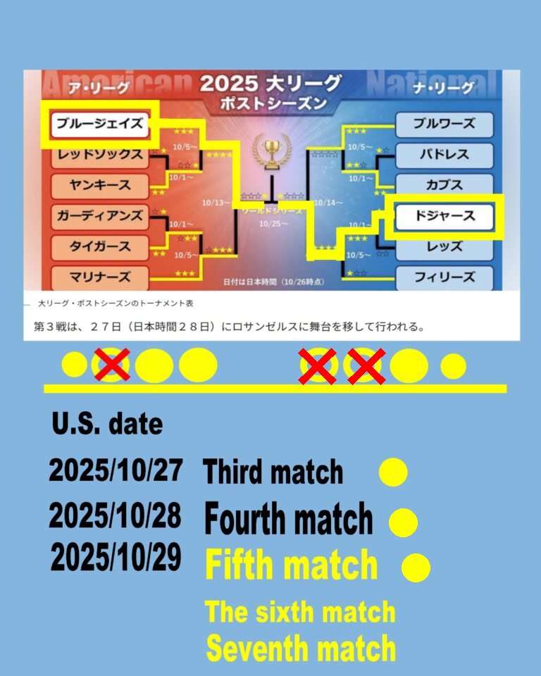 MLB…ワールドシリーズ 2025の 第6戦=Game 6 は、アメリカ時間( じかん )で🗓️2025年10月31日( 金=Friday )に開催( かいさい )されます。