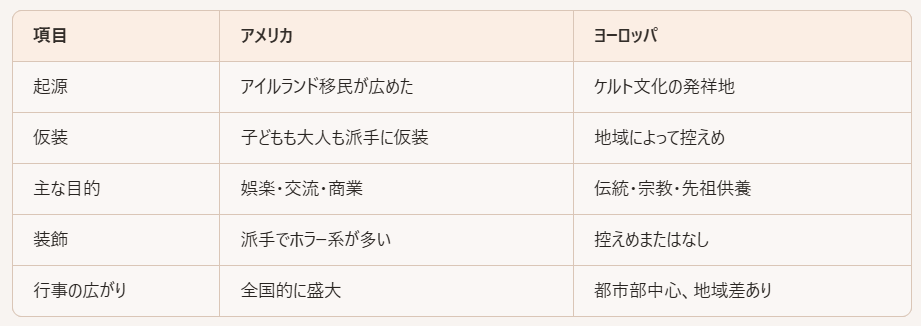 ヨーロッパの….ハロウィンは伝統的( でんとうてき )・宗教的( しゅうきょう てき )な 色合( いろあい )い が 強( つよ )く、アメリカの ハロウィンはエンタメ性( せい)・商業性( しょうぎょう せい )が 際立( きわだ )っています。