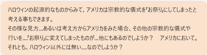 はい、ハロウィン….以外( いがい )にも、アメリカでは 宗教的( しゅうきょうてき )な 儀式( ぎしき )や 記念日( きねんび )が「お祭( まつ )り」や 祝祭( しゅくさい )イベントとして 世俗化( せぞくか )・娯楽化( ごらくか )されて いる 例( れい )が複数( ふくすう )あります。