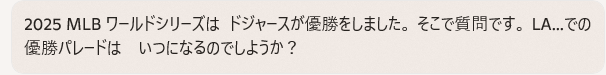 ロサンゼルス・ドジャースの優勝( ゆうしょう )パレードは、現地時間( げんち じかん )で 2025年 11月3日 午前( ごぜん )11時( じ )、日本時間( にほん じかん )では 11月4日 午前( ごぜん ) 4時( じ )に 開催( かいさい )されます