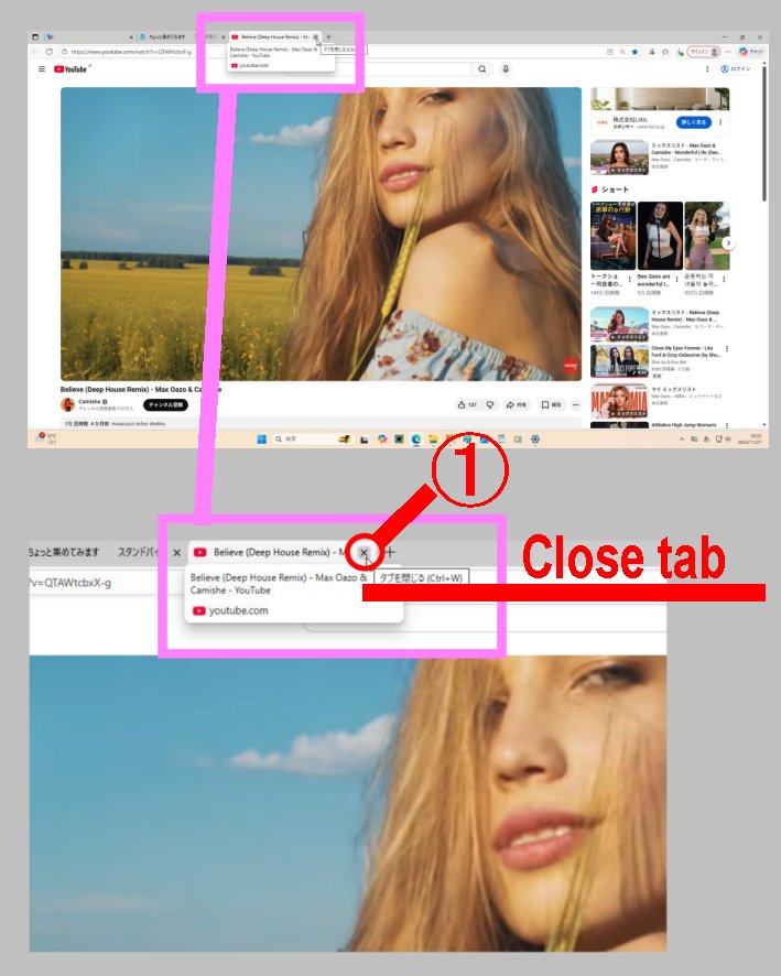 You Tube の 本画面( ほん がめん )の 上( うえ )にある= Taskbar の 中( なか )の You Tube を 閉じるボタン ① = ✖ ボタン ① Close button を