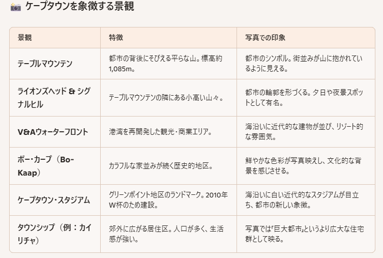 👉 ご希望なら、ケープタウンの「文化的シンボル」(ボー・カープの街並み、ロベン島、ケープ・マレー料理など)をさらに詳しく掘り下げて整理することもできます。