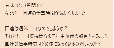- 標準勤務時間:多くの国連職員は 月曜~金曜の平日勤務、1日約7~8時間程度が基本。