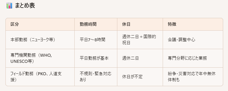 - 国連職員の働き方は一律ではない:所属機関や勤務地によって大きく異なる。