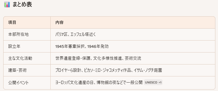 - 芸術作品に関しては「UNESCO Headquarters art collection」など英語検索も有効。英語だと公式資料や国際的な記事が多く見つかります。