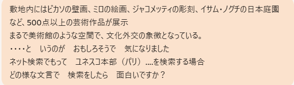 いい視点ですね!ユネスコ本部(パリ)は「文化外交の美術館」とも言える場所なので、検索ワードを工夫すると面白い情報に出会えます。例えば以下のような検索文言がおすすめです: