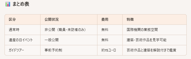 結論:ユネスコ本部(パリ)の芸術作品はルーブル美術館のように常時一般公開されているわけではなく、基本的には職員や来訪者が目にするための「文化外交の象徴」として位置づけられています。ただし、特別イベントやガイドツアーの際には一般の人も見学でき、無料公開と有料ツアーの両方の機会があります。