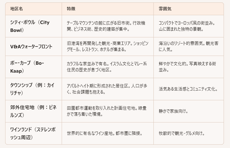 ケープタウンは 自然と都市がモザイク状に重なり合う多層的な都市 であり、写真では一枚岩の大都会に見えなくても、実際には複数の街区が寄り集まって国際都市を形づくっています。