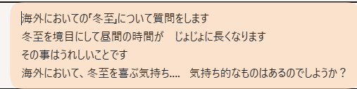 海外においての「冬至」について質問をします 冬至を境目にして昼間の時間が じょじょに長くなります その事はうれしいことです 海外において、冬至を喜ぶ気持ち…. 気持ち的なものはあるのでしようか?