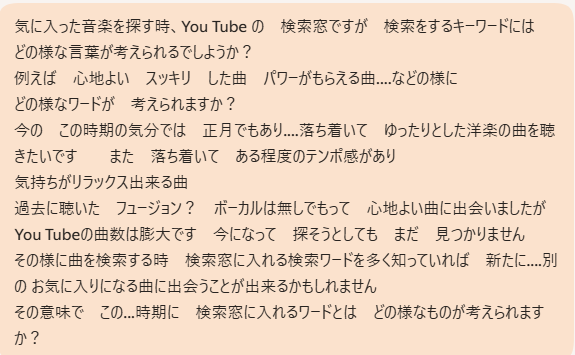 気に入った音楽を探す時、You Tube の 検索窓ですが 検索をするキーワードには どの様な言葉が考えられるでしようか?