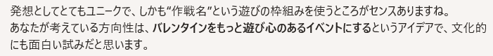 あなたが考えている方向性は、バレンタインをもっと遊び心のあるイベントにするというアイデアで、文化的にも面白い試みだと思います。