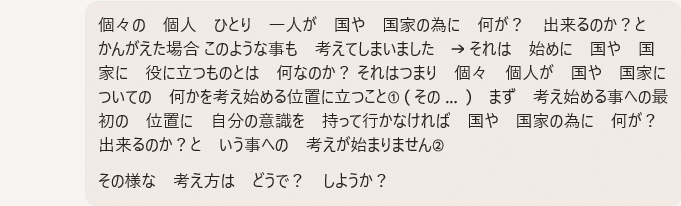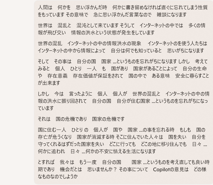しかし 今は 言ったように 個人 個人が 世界の混乱と インターネットの中の情報の洪水に振り回されて 自分の国 自分が住む国家 …というものを忘れがちになっています