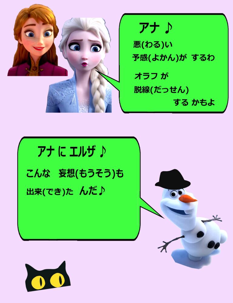 オラフ ....なに? エルザ また 心配な 流れに なってきたけれど だいじょうぶ? なのかしら