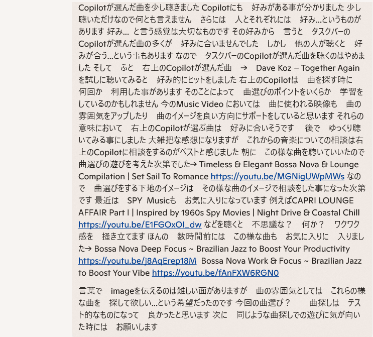 それらの意味において 右上のCopilotが選ぶ曲は 好みに合いそうです 後で ゆっくり聴いてみる事にしました 大雑把な感想になりますが これからの音楽についての相談は右上のCopilotに相談をするのがベストと感じました