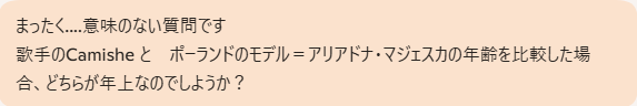 まったく….意味( いみ )のない 質問( しつもん )です 歌手( かしゅ )のCamishe と ポーランドのモデル=アリアドナ・マジェスカの年齢( ねんれい )を比較( ひかく )した 場合( ばあい )、どちらが 年上( としうえ )なのでしようか?