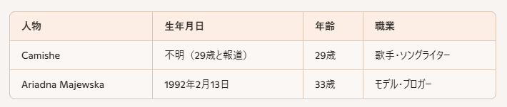 歌手( かしゅ )の Camisheは 現在( げんざい ) 29歳( さい )、一方( いっぽう ) ポーランドの モデル・ブロガーの アリアドナ・マジェスカは 33歳( さい )です