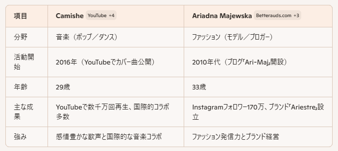 | 分野 | 音楽(ポップ/ダンス) | ファッション(モデル/ブロガー) |