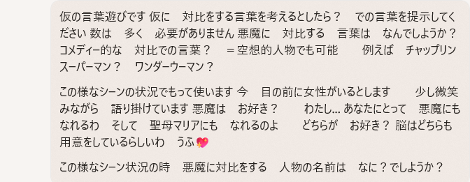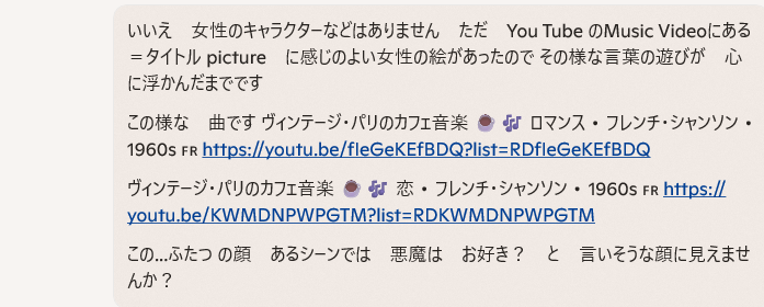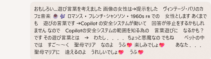 おもしろい…遊び言葉を考えました 画像の女性は→提示をした ヴィンテージ・パリのカフェ音楽 ☕🎶 ロマンス • フレンチ・シャンソン • 1960s 🇫🇷 での 女性とします あくまでも 遊びの言葉です →Copilot の安全システムが働いて 回答が停止をするかもしれません なので Copilotの安全システムの範囲を知る為の 言葉遊びに なるかも?です その遊び言葉とは → わたし .... ちょっと悪魔なの でもね ベットの中では すご~~く 聖母マリア なのよ うふ💖 楽しみでしょ💖 あなた ... 聖母マリアに 逢えるのよ うれしいでしょ💖 うふ💖