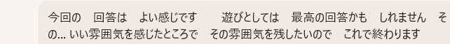 今回の 回答は よい感じです 遊びとしては 最高の回答かも しれません その… いい雰囲気を感じたところで その雰囲気を残したいので これで終わります