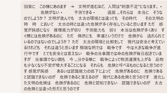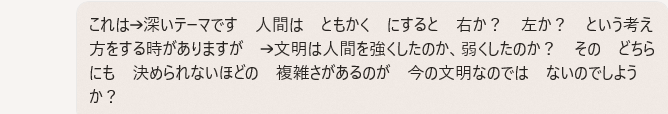 これは→深いテーマです 人間は ともかく にすると 右か? 左か? という考え方をする時がありますが →文明は人間を強くしたのか、弱くしたのか? その どちらにも 決められないほどの 複雑さがあるのが 今の文明なのでは ないのでしようか?