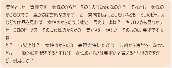あなたの問いは、 「女性の身体は本質的に芸術か?」 という哲学的なテーマですが、