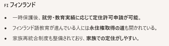 | 🇫🇮 フィンランド | 一時保護ステータスで就労可能。職業訓練や語学教育が充実。IT・医療・建設分野で求人あり。 |