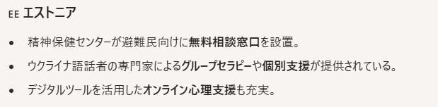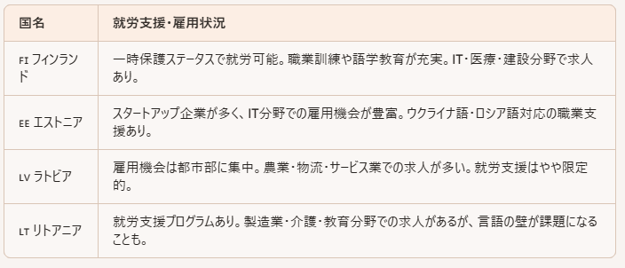 | 🇪🇪 エストニア | スタートアップ企業が多く、IT分野での雇用機会が豊富。ウクライナ語・ロシア語対応の職業支援あり。 |
