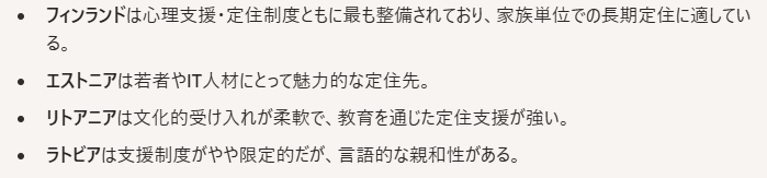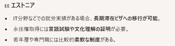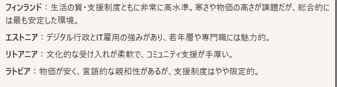 | 🇪🇪 エストニア | デジタル行政が進んでおり、行政手続きがスムーズ。物価は比較的安め。ロシア語話者が多く、言語面での親和性あり。 |