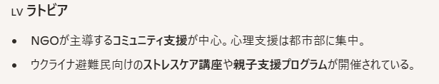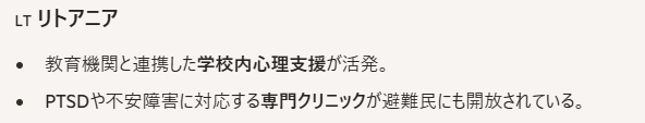 | 🇱🇹 リトアニア | 子ども向けの心理支援や文化交流プログラムが充実。教育機関との連携が強い。 |