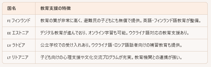 | 🇪🇪 エストニア | デジタル教育が進んでおり、オンライン学習も可能。ウクライナ語対応の教育支援あり。 |