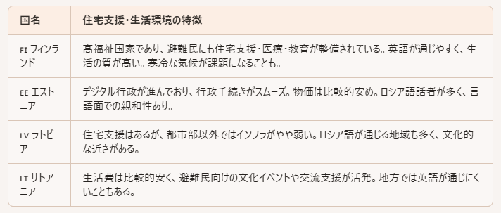 ありがとうございます!それでは、ウクライナ避難民にとって「住みやすい」とされる国について、フィンランド・エストニア・ラトビア・リトアニアの4か国を中心に、以下の3つの視点から比較してみましょう: