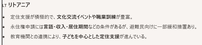 | 🇱🇹 リトアニア | 生活費は比較的安く、避難民向けの文化イベントや交流支援が活発。地方では英語が通じにくいこともある。 |