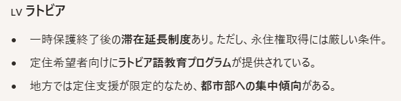 | 🇱🇻 ラトビア | 雇用機会は都市部に集中。農業・物流・サービス業での求人が多い。就労支援はやや限定的。 |