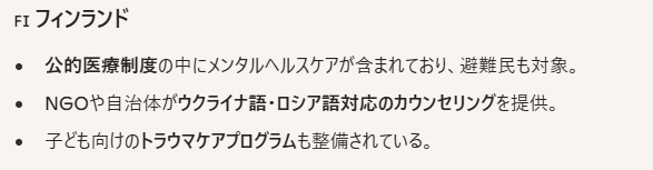 フィンランドでは、避難民向けの心理カウンセリングが充実しており、戦争によるトラウマを抱える人々にとって大きな支えとなっています。