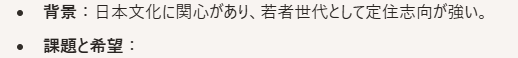 背景:日本文化に関心があり、若者世代として定住志向が強い。