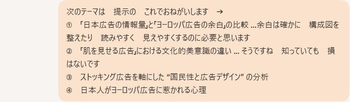この4テーマは、ブログ記事として 1本ずつ独立した記事 にもできるし、 「日本とヨーロッパの広告美学」シリーズ としてまとめても魅力的です。