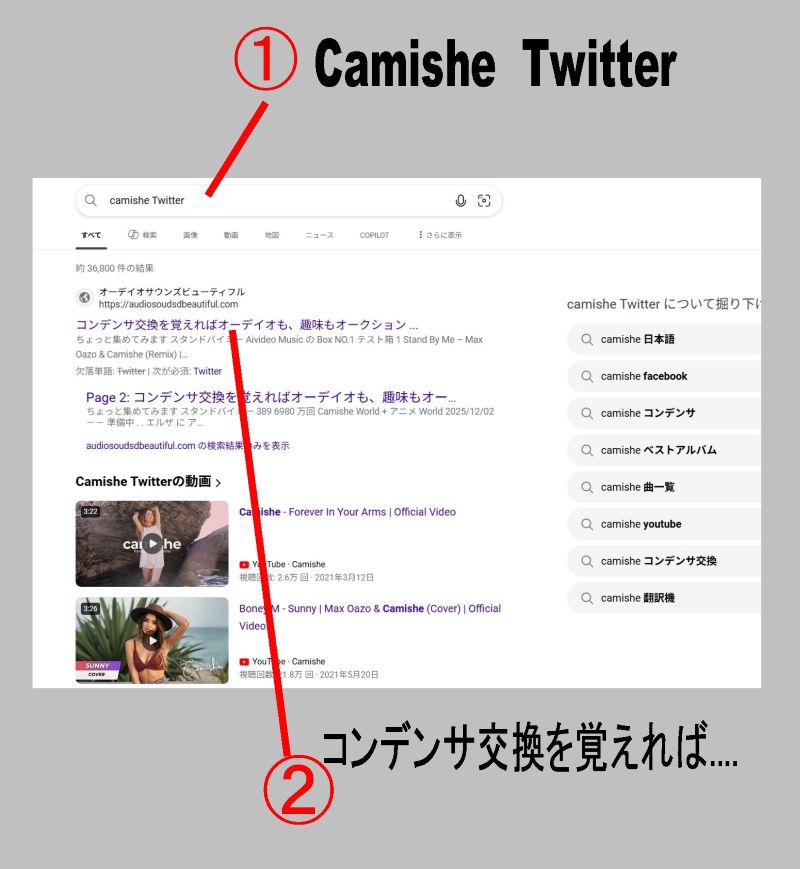 検索窓に Camishe Twitter と 打ち込むと この様な画面が出ます